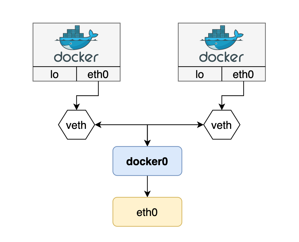 Docker 컨테이너가 실행되면 컨테이너에 172.17.0.0/16 이라는 서브넷 마스크를 가진 프라이빗 IP주소가 eth0으로 자동으로 할당된다. 이 가상 NIC는 OSI 참조 모델의 레이어 2인 가상 네트워크 인터페이스로, 페어인 NIC와 터널링 통신을 한다.