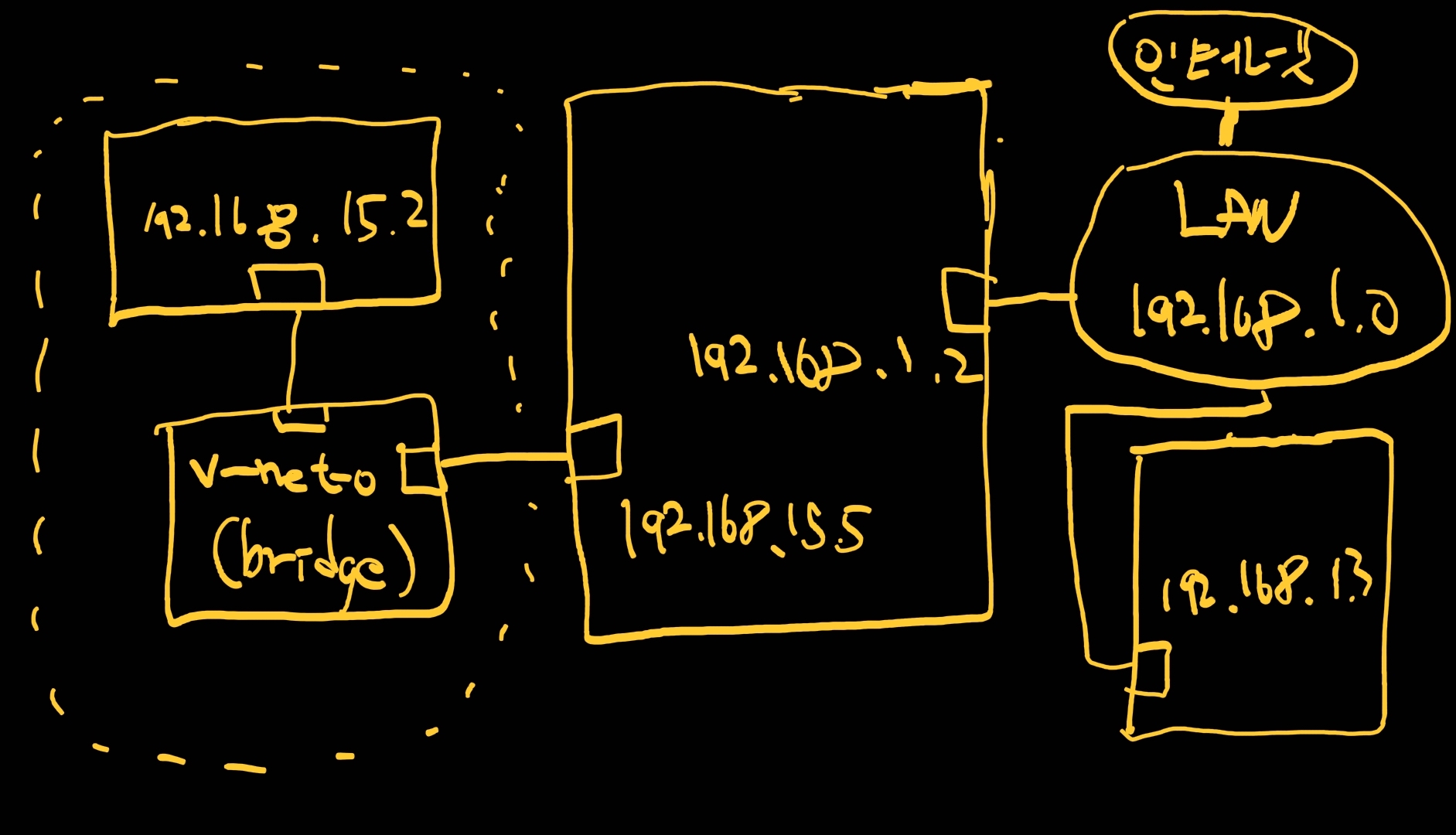 $ ip netns exec {network_namespace} ip route add 192.168.1.0/24 via 192.168.15.5(bridge network ip address)